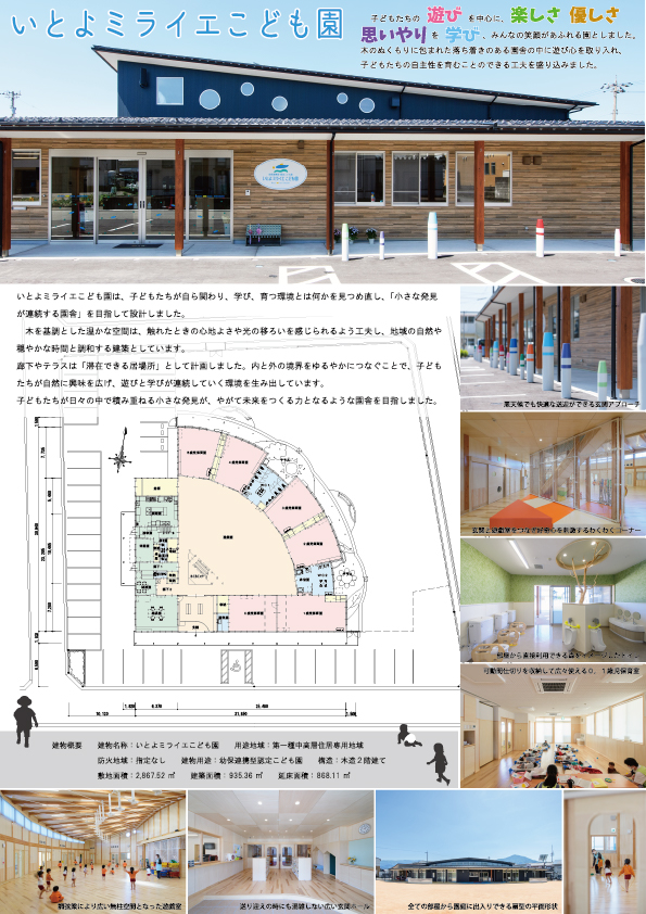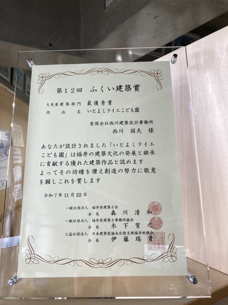 いとよミライエこども園の理事長先生、園長先生、施工業者である大野建設工業株式会社の皆様のおかげで最優秀賞を受賞することができました。